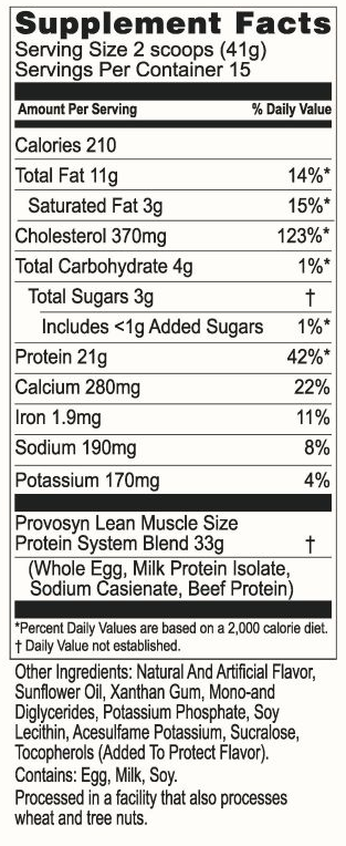Provosyn is an old-school protein formula that delivers new-school results. Its recipe was inspired by Rheo Blair, a nutritional guru of the 1950s and 1960s. Blair created a secret formula consisting of whole egg and milk protein for his elite Hollywood clients who needed to gain lean muscle fast. He also advised that they include beef in their diet and limit their intake of carbs. Size: 1lb, 5.7oz (About 15 servings)