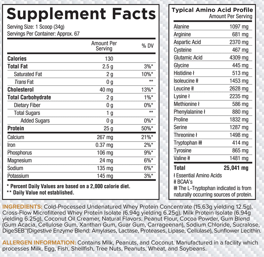 The blend includes cold-processed whey concentrate, whey isolate, and milk protein isolate, providing a complete amino acid profile.