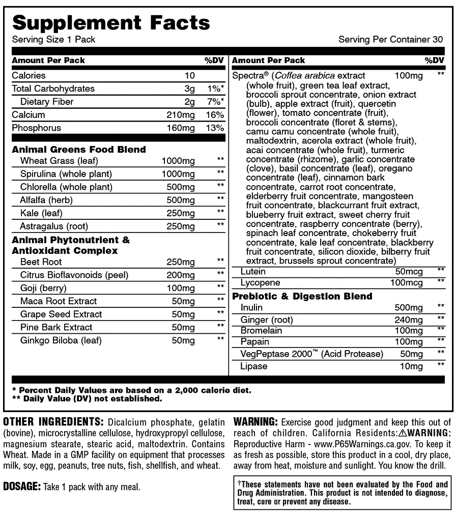 Packed with superfoods and antioxidants, Animal Greens is a complete, optimally calibrated, and balanced greens nutrition powerhouse that delivers natural compounds found in kale, wheat grass, alfalfa, Spirulina, chlorella and more.