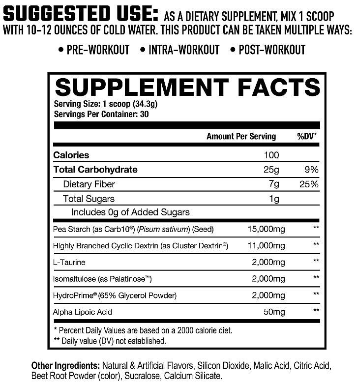Supplement Facts DEM0DAY Serving size: One scoop (34g) Servings per container: 30 Calories 100 Amount per serving % Daily Value Total Carbohydrate 25 g 9% Dietary Fiber 0 g 0% Total Sugars 2 g ** Added Sugars 2 g 4% Carb10 (Legume-base starch derived from Pisum sativum (peas)) 15,000 mg ** Highly Branched Cyclic Dextrin (Cluster Dextrin) 11,000 mg ** Isomaltulose (Palatinose) 2,000 mg ** L-Taurine 2,000 mg ** Glycerol Powder (standardized to 65% Glycerol (HydroMax)) 2,000 mg ** Organic Cinnamon Extract (Cinnamomum cassia) (bark) 50 mg ** Alpha Lipoic Acid 50 mg ** Ingredients: Natural & Artificial Flavors, Beet Root Powder (for color), Malic Acid, Sucralose, Citric Acid, Silicon Dioxide