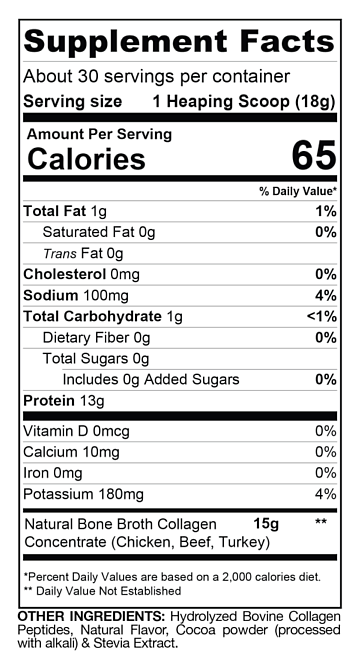 All Natural Types I, II & III CollagenHigh in Muscle Building Animal Protein†Advanced Support For Joint & Digestive Health†Mixes instantly into any mealBone Broth is an all natural bone extract from our food supply. It contains 15 grams of type I, II & III collagen to help support joint, digestive and immune health. With 13 grams of protein and high concentrations of glucosamine and chondroitin, bone broth could have a monstrous effect on inflammation, joints, tendons, athletic performance & muscle recovery.†