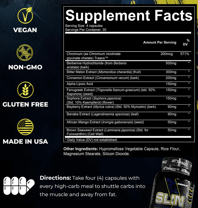 UNLEASH THE POWER OF SLIN Enhanced Labs meticulously combined nature's carb converters and glucose regulators in each Slin pill. This revolutionary approach formed the best nutrient partitioner, which efficiently delivers carbs to muscles. Never again will cheat meals compromise your gains but instead shuttle it all in your muscle for maximum growth.