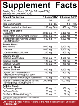 Check out the formula - Reloaded is a pre-workout that stands above the crowd with an exceptional list of ingredients. 5% Nutrition has always been one of the few companies that feature Creatine Monohydrate in our pre-workouts. Now, we've gone a step further and created an exclusive Creatine Blend that features Creatine Monohydrate and 2 other forms of Creatine. What about Caffeine? We thought you'd never ask! Now, there are 3 sources supplying 360 mg of Caffeine (at two scoops). And there's also a whopping 8 grams (at 2 scoops) of pure L-Citrulline - the most we've ever put in a pre-workout. Reloaded is an outstanding pre-workout featuring an advanced combination of energy, pump, focus, endurance, and performance ingredients. Of course, every ingredient with its dosage is clearly listed on the label - there are no prop blends here! The ingredient profile is designed to create a complete, balanced pre-workout. Reloaded has it all, and of course, it tastes incredible, making it a treat for your taste buds!