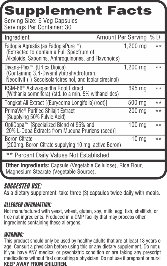 Fadogia Agrestis PE: Fadogia Agrestis is an herb that is indigenous to Africa that has been used for centuries as a male aphrodisiac and has been shown in rodent studies to potently increase testosterone and boost libido. Unlike other aphrodisiacs, Fadogia Agrestis has also demonstrated an ability to increase ejaculation latency; potentially allowing men to last longer in bed.