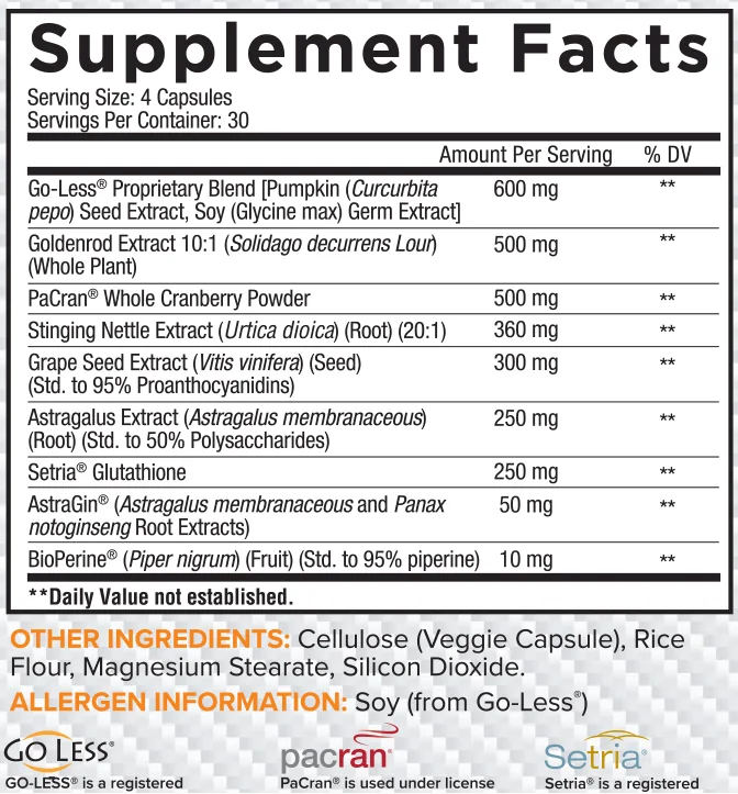 Go-Less®: A blend of pumpkin seed extract and soy germ extract to promote healthy kidney and bladder function. Goldenrod Extract: : Renowned for its diuretic, anti-inflammatory, and antimicrobial properties to support a healthy urinary system. PaCran® Cranberry Extract: Helps protect against UTIs and encourages regular urinary flow. Go-Less® is a clinically studied blend of pumpkin seed and soy germ extracts designed to support kidney and bladder health. It promotes bladder strength and flexibility, reduces urgency, and improves overall bladder function, making it especially beneficial for individuals with overactive bladder (OAB) symptoms. Clinical studies have shown that Go-Less® helps reduce urinary frequency and urgency, leading to improved bladder control and sleep quality. The supplement also supports kidney health by aiding in detoxification and helping the kidneys efficiently filter waste and excess fluids, lowering the risk of kidney-related issues.