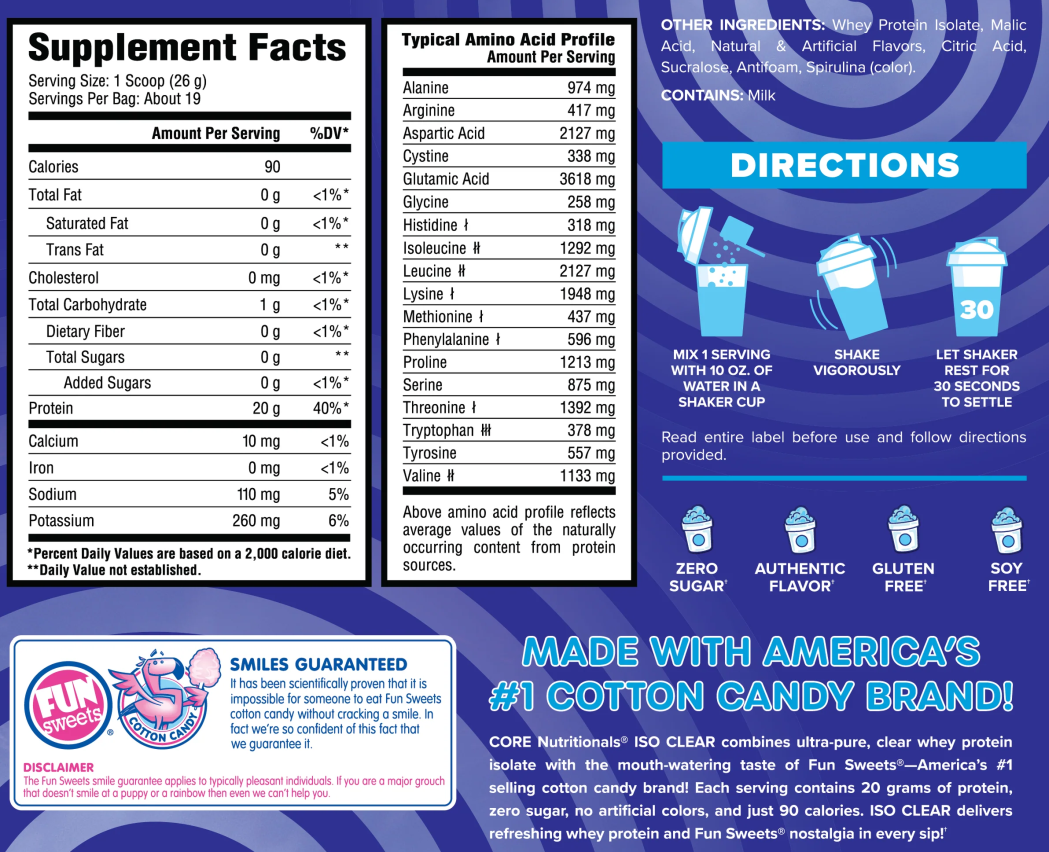 Core Nutritionals ISO Clear Whey Protein Isolate Fun Sweets Cotton Candy Blue Raspberry - 19 Servings Item #: CU175UPC: 850057789737