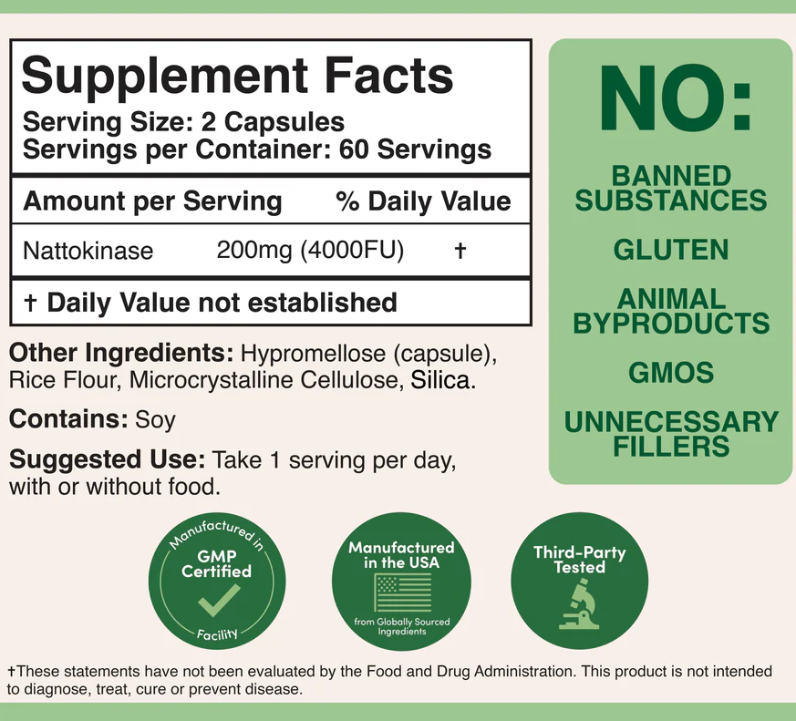 TWO-MONTH SUPPLY: Our Nattokinase supplement contains 60 servings of 200 mg (4,000 FU), which equals 120 capsules (100 mg, 2,000 FU per capsule)