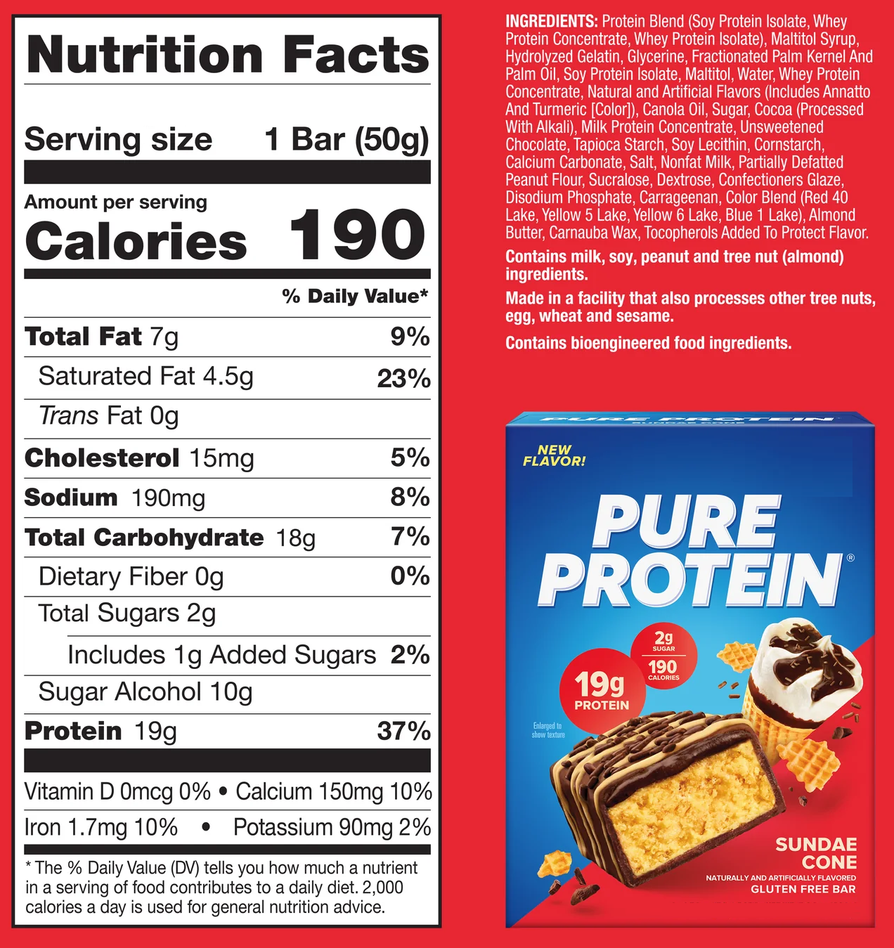 Delightful Protein-Packed Bars! Pure Protein Sundae Cone Protein Bars are delicious high-protein snacks that support lean muscle and strength. Each Sundae Cone protein bar contains 19 grams of protein, 190 calories, and 2 grams of sugar, making it a great-tasting and gluten-free option.