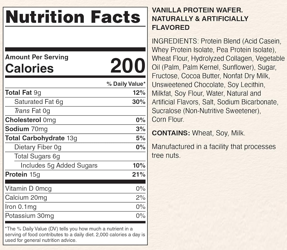 Vanilla: Wheat Flour (Wheat Flour, Calcium Carbonate, Reduced Iron, Niacinamide, Thiamin), Protein Blend (Milk Protein Isolate, Whey Protein Isolate, Acid Casein, Pea Protein Isolate), Hydrolyzed Gelatin, Palm Kernel Oil and Fractionated Palm Oil, Sugar Fructose, Cocoa Butter, Nonfat Dry Milk, Cocoa Liquor, Soy Lecithin, Milk Fat, Soy Flour, Water, Sunflower Oil, Natural & Artificial Flavors, Salt, Sodium Bicarbonate, Sucralose, Corn Flour. CONTAINS MILK, WHEAT and SOY.