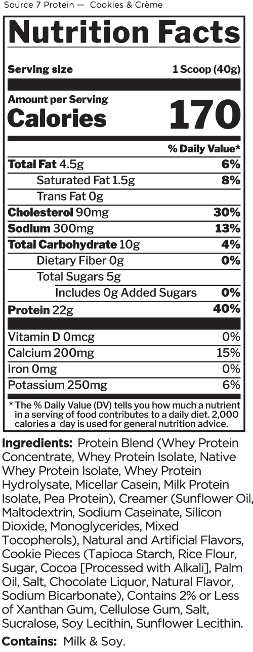 Source 7 Protein Multi-Source Protein Blend Source 7 Protein combines seven premium protein sources in each ultra-creamy, extra-decadent shake. The exceptionally great taste is complemented by easy mixing and 22 grams of high-quality protein per serving. It’s perfect for anyone starting a protein journey or seeking a delicious change from the usual scoop, Source 7 Protein is a great anytime—or all-the-time—addition to an active lifestyle.