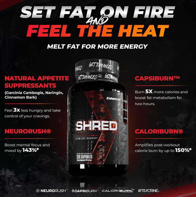Hardcore Fat Burner The final piece in achieving your dream physique is here! Shred's 15 synergistic formula accelerates your fat-burning potential to new heights. Experience its advanced scientific formula as you harness a wide array of fat mobilizers, thermogenic compounds, and appetite control blends—reinforced with anti-fatigue elements to eliminate common stimulant drawbacks keeping you locked-in and steady all season long.
