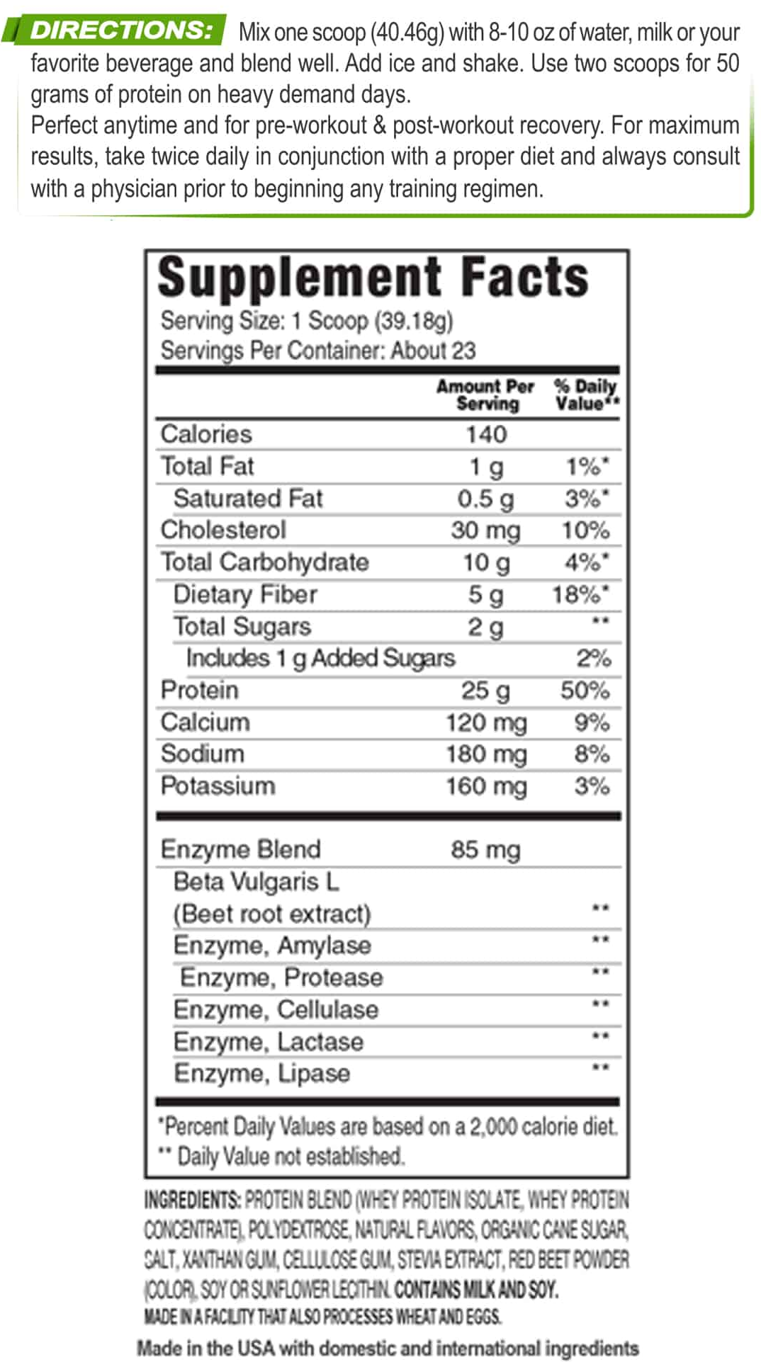 Provides 25g of a whey isolate/concentrate blend plus digestive enzymes and 5 grams of fiber. It contains no aspartame or any other artificial ingredients.
