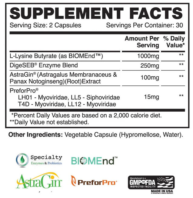 1,000mg L-Lysine Butyrate (as BIOMEnd™) for intestinal barrier integrity.† 250mg DigeSEB® Enzyme Blend for complete macronutrient breakdown.† 100mg AstraGin® for enhanced nutrient absorption.† 15mg PreforPro® 4-strain prebiotic blend for microbiome optimization.† 100% Transparent Label 2 Capsules – Maximum Absorption – Zero Waste We didn’t just throw some digestive enzymes in a bottle and call it gut health. Every serving delivers clinical-grade compounds that transform your digestive system into a nutrient absorption machine. The 1,000mg BIOMEnd™ L-Lysine Butyrate provides the highest bioavailable form of butyrate for intestinal lining repair and anti-inflammatory support, not the sodium butyrate garbage that breaks down before reaching your colon. This patented compound actually survives stomach acid and reaches your intestinal cells intact, where it strengthens tight junctions and reduces intestinal permeability.